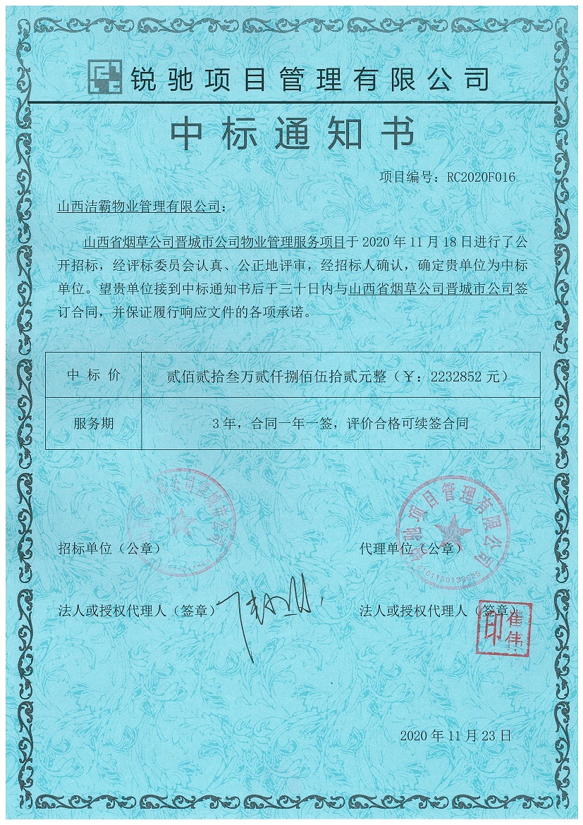 2020年11月18日,山西省煙草公司晉城公司物業(yè)管理服務(wù)項(xiàng)目開(kāi)標(biāo)會(huì)議在晉城市文昌東街1560號(hào)南環(huán)供電營(yíng)業(yè)站一樓東會(huì)議室舉行。在經(jīng)過(guò)幾個(gè)小時(shí)的激烈競(jìng)標(biāo)過(guò)程評(píng)選后,從開(kāi)標(biāo)室傳出喜訊,山西潔霸物業(yè)管理有限公司成功中標(biāo)。中標(biāo)金額為2232852元,合同期一年。此次中標(biāo)為潔霸物業(yè)今年的業(yè)績(jī)?cè)偬硪还P輝煌。