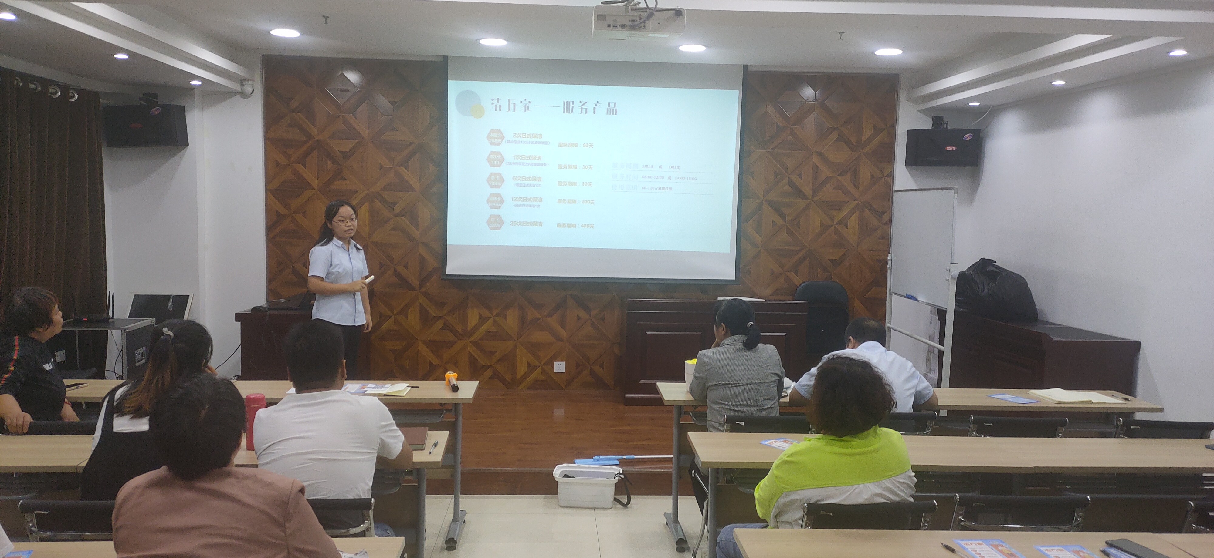 隨后由公司人力資源部負(fù)責(zé)人司夢(mèng)琴對(duì)“潔萬(wàn)家”日常保潔產(chǎn)品進(jìn)行了分類介紹,此外還介紹了產(chǎn)品推廣獎(jiǎng)勵(lì)方案和推廣話術(shù),對(duì)大家日后推廣過程中會(huì)遇到的客戶提出的各種問題進(jìn)行了預(yù)設(shè)并一一詳細(xì)作答。