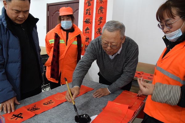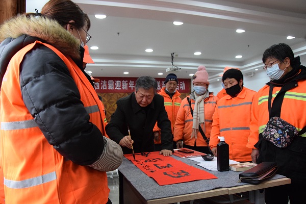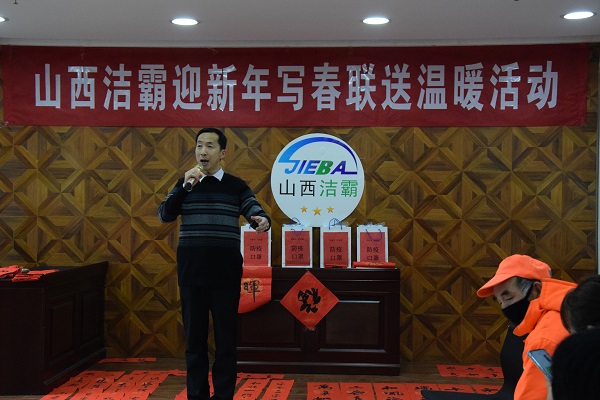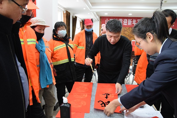 現(xiàn)場人頭攢動(dòng),熱鬧非凡,處處洋溢著歡樂喜慶的氣氛。賈大一老師剛執(zhí)墨筆,就吸引了現(xiàn)場數(shù)十名員工駐足觀賞。他的書法如行云流水,一副寓意著對新年美好祝福的春聯(lián)便一氣呵成。各位老師揮毫潑墨,一幅幅散發(fā)著清新墨香的春聯(lián)展現(xiàn)在大家面前。“梅花獎(jiǎng)”獲得者張保平老師現(xiàn)場演唱上黨梆子戲曲名段,字正腔圓,渾厚豪邁,把活動(dòng)推向了高潮。市總工會副主席韓敦峰為員工分發(fā)了對聯(lián)和防疫口罩。