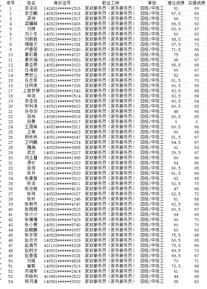 晉城市潔霸清潔服務(wù)股份有限公司職業(yè)技能等級認(rèn)定中心2024年1月21日上午第3批家政服務(wù)員中級認(rèn)定人員成績公示