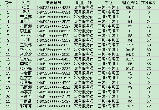 晉城市潔霸清潔服務(wù)股份有限公司職業(yè)技能等級認(rèn)定中心2024年4月28日第1批家政服務(wù)員高級認(rèn)定人員成績公示